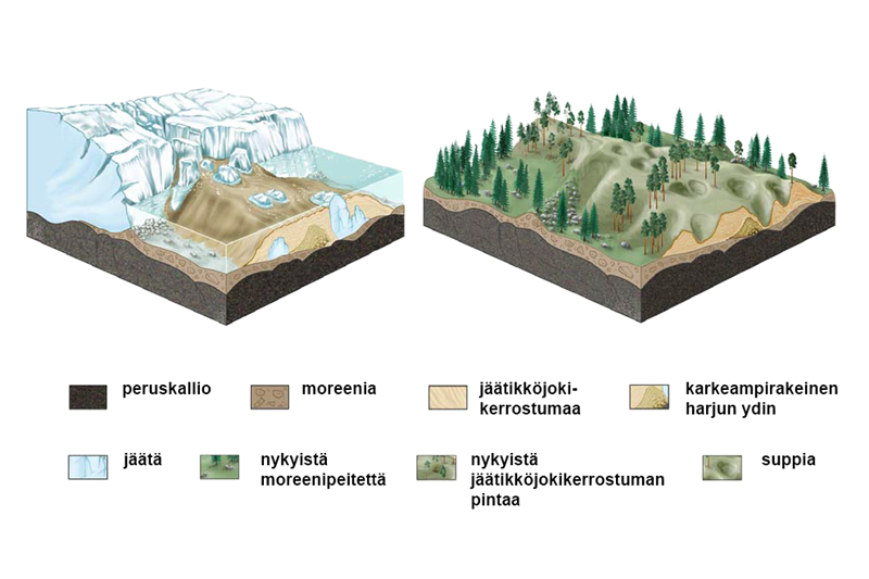 Jää murskaa, siirtää ja kasaa kiviainesta. Jäätikön sulamisen jälkeen erikokoiset mineraalimaan kappaleet hienosta hiekasta isoihin kiviin muodostavat moreenia[käsite: moreeni – Jäätikön murskaama ja kuljettama aines, joka sisältää kaikenkokoista maa-ainesta.], joka on Suomen yleisin maalaji. Noin puolet maamme pinta-alasta on moreenia.