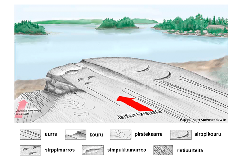 - Jäätikön sulavesin aiheuttamat kulutusmuodot: hiidenkirnut, harjujen pyöristyneet kivet.