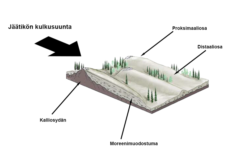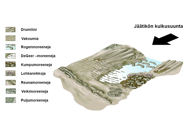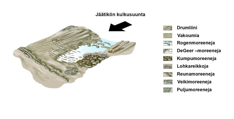 Jäätikön alla olevien kalliokumpareiden ympärille kasaantui drumliineja[käsite: drumliini – Jäätikön kalliokumpareen ympärille kasaama moreeniharjanne. Drumliini on jäätikön kulkusuunnan mukainen.] eli moreeniharjanteita, jotka ovat jäätikön kulkusuunnan suuntaisia. Jäätikön reunaan kasaantui reunamoreenia.