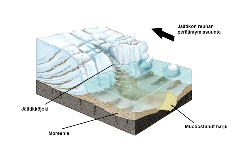 - Jäätikkö siirtää irtainta maa-ainesta ja kasaa sitä erilaisiksi muodostumiksi kuten jään reunan suuntaisiksi reunamuodostumiksi ja jään liikkeen suuntaisiksi harjuiksi.