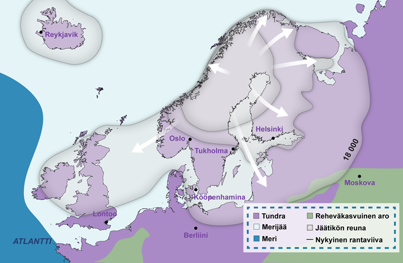 Jääkaudella[käsite: jääkausi – Maapallon ilmastollisesti kylmä ajanjakso. Voidaan tarkoittaa joko pitkää vuorottaisten jäätiköitymisten ja interglasiaalikausien kokonaisuutta tai vain yhtä interglasiaalikausien välistä kylmää ajanjaksoa.] runsaan kahden kilometrin paksuinen jäämassa painoi kiinteää maankuorta sen alla olevaan vaippaan noin 800 m alaspäin. Kun jää suli ja sen paino poistui maankuoren päältä Suomen kohdalla, alkoi maankohoaminen[käsite: maankohoaminen – Ilmiö, jossa maankuori nousee ylöspäin esimerkiksi jäätikön painon poistuttua.], joka etenee Perämeren rannikolla on nykyäänkin lähes 1 cm vuodessa.